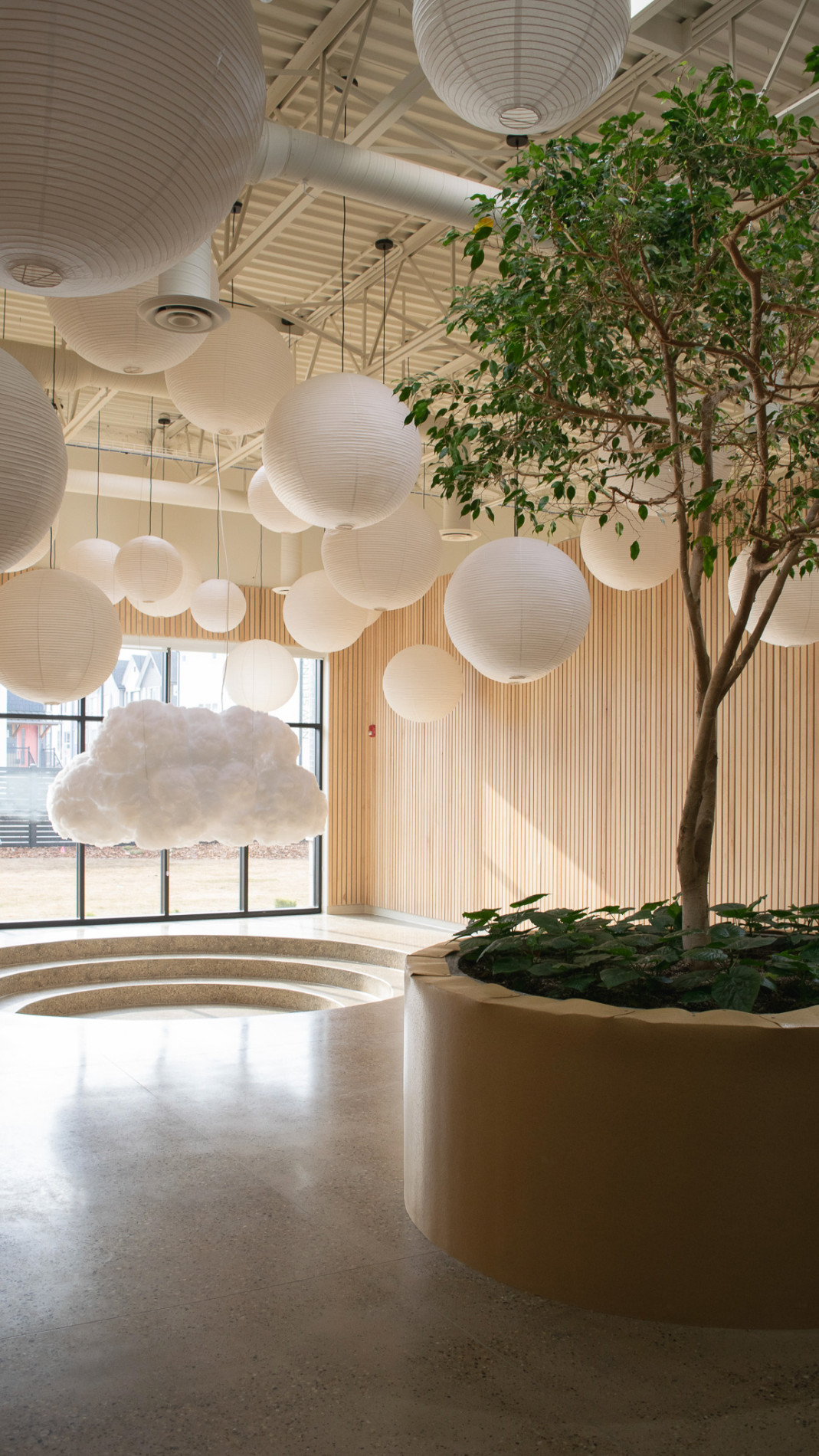 These were new builds, so we had the chance to talk with the developers at the beginning. They would say, this is what we are building, and ask if there was something we would do to make it more Bambini. I would say, let’s expand these windows and make them floor to ceiling instead of little boxes. Maybe we can add some skylights. Before you pour the concrete, let’s design some structures into it, like the conversation pit or other elements, so we can integrate them into the building rather than adding them later.