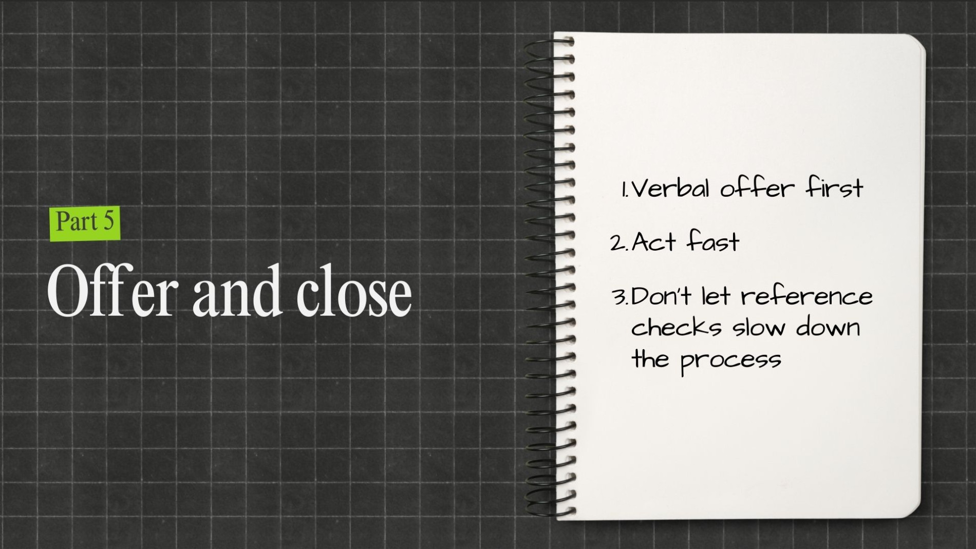 Start with a verbal offer to align on terms, then follow up immediately with the formal contract. Do not let administrative paperwork or slow reference checks stall the process; if necessary, make the offer “subject to references” to keep the momentum alive.